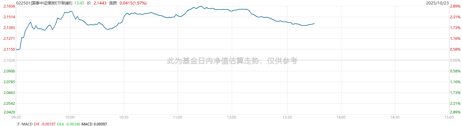 今天的A股市场彻底被煤炭板块点燃了!截至10月23日盘中,陕西黑猫、云煤能源、郑州煤电等多只个股直线封板,大有能源更是狂揽10日9板,累计涨幅近150%,板块指数10月以来已飙升超12%。跟风上车的朋友有福了——$国泰中证煤炭ETF联接E$ 实时估值暴涨2.63%,这波"煤飞色舞"的行情,它直接吃到了大肉!