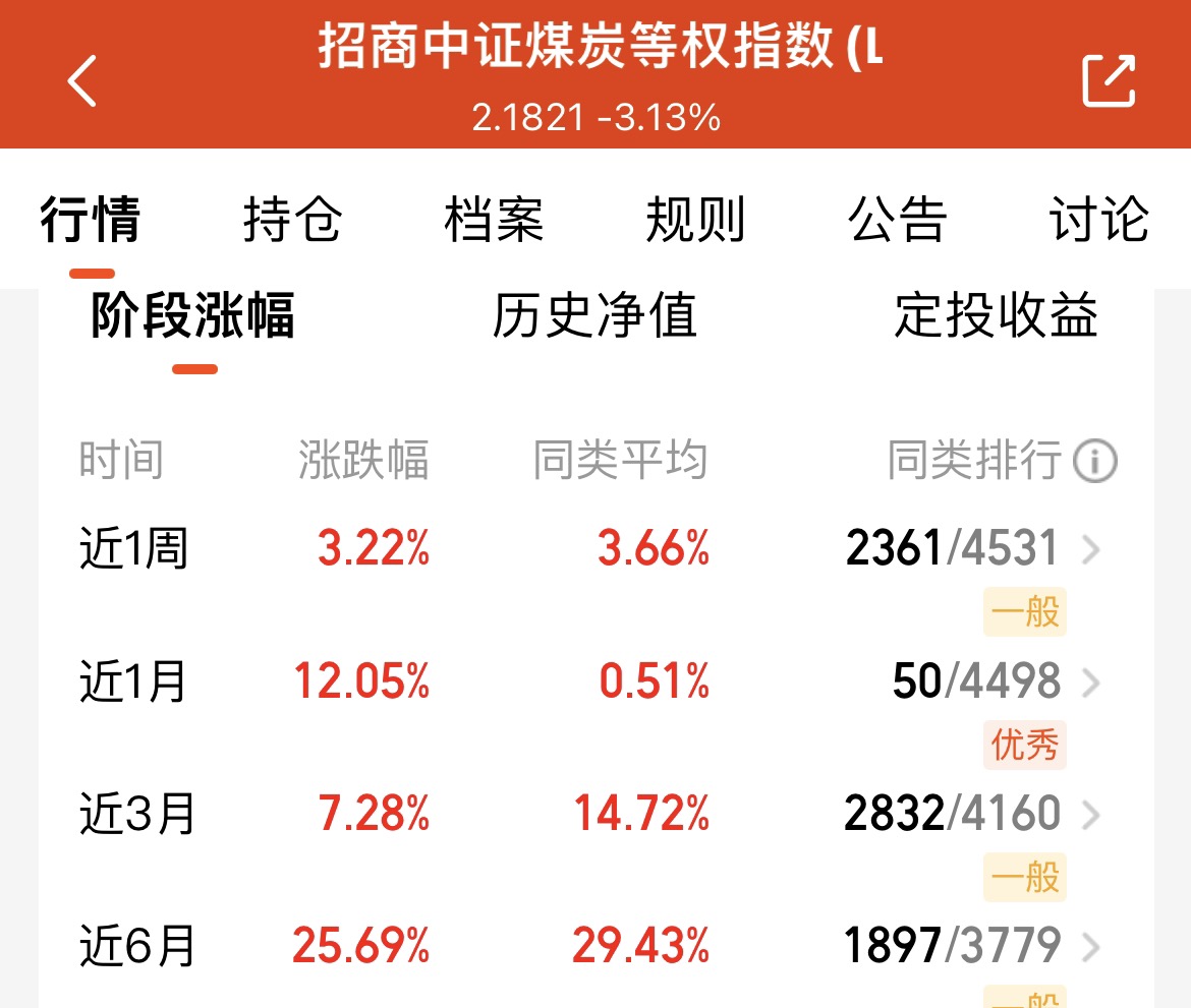 $招商中证煤炭等权指数(LOF)C$ 近期表现亮眼!它跟踪中证煤炭等权指数,重仓龙头股,今日盘中估值涨1.48%,近一周、一月、六月分别涨3.22%、12.05%、25.69%,各阶段业绩均列同类首位!