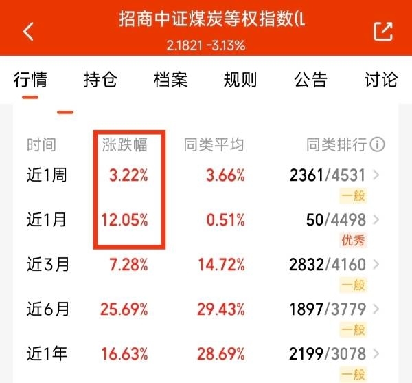今天有关注到$招商中证煤炭等权指数(LOF)C$ 这只聚焦煤炭的指数基金。紧密跟踪中证煤炭等权指数。全面盖了煤炭产业上下游产业。近一周上涨了3.22%,近半年上涨25.37%。同类基金长期做到了优秀。基金跟踪指数精准度高。而且遇到波动稳定性也比较好。我看好未来在煤炭板块中上涨的成长表现。准备开始布局了。#A股逼近4000点!半日成交1.5万亿# $南方中证全指电力公用事业ETF发起联接C$ $鹏华中证银行指数(LOF)C$ $华安中证银行ETF联接C$