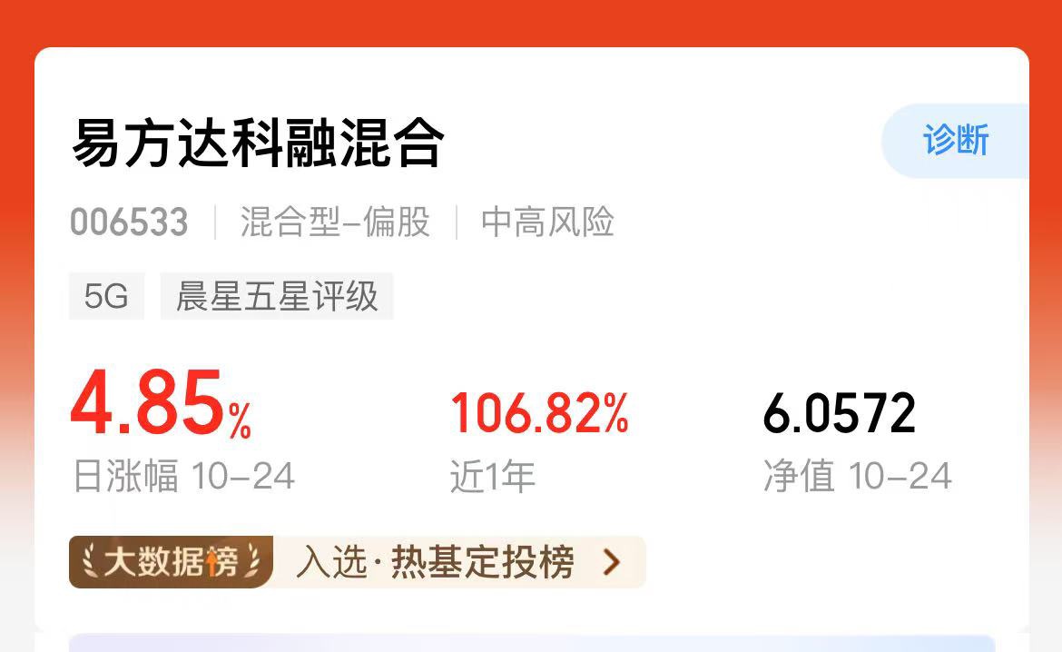 虽然说上证指数今天一举站上了4000点,但是现在的行情轮动的还是很快的,我觉得我们可以去多元化的布局,攻守兼备去找一些有性价比的基金,就比如我一直看好的这一个易方达科融混合也不错,他也深度参与了科技,新能源,军工轮动的配置,夏普比率优秀是成长里的均衡之选,拉长周期来看三年5年夏普率持续优秀,而且他的是回撤做的也比较好,是成长里的均衡之选,更适合当前想跟上科技牛市,但是又不想有波动比较大的我。最近他的回撤控制的特别的好,我先跟上了