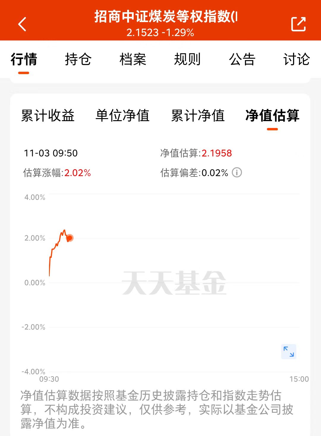 友友们,今天大盘指数低开低走,跟这个寒冷的冬天一样释放寒意,不过煤炭板块今天逆势上涨呢,第四季度煤炭板块价值重估正当时,$招商中证煤炭等权指数(LOF)C(OTCFUND|013596)$今天盘中估值上涨2.02%,而且现在价格处于历史偏低区域,有充足的反弹空间呢。可以关注一下。