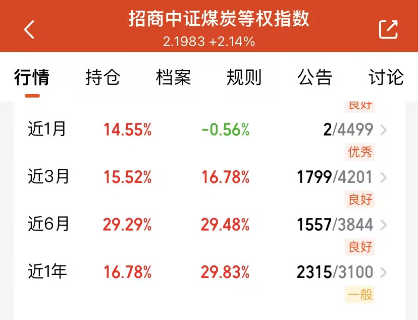 今天煤炭板块接着表现韧性不错!我看好的$招商中证煤炭等权指数(LOF)C(OTCFUND|013596)$目前实时估值虽然绿了%,近一个月也涨了 14.55%,收益率远超同类平均,业绩排名还很靠前。现在煤炭供应偏紧,又有冷冬预期和政策稳价托底,我觉得四季度煤炭板块会有新一波上涨动力,所以果断定投上车了!