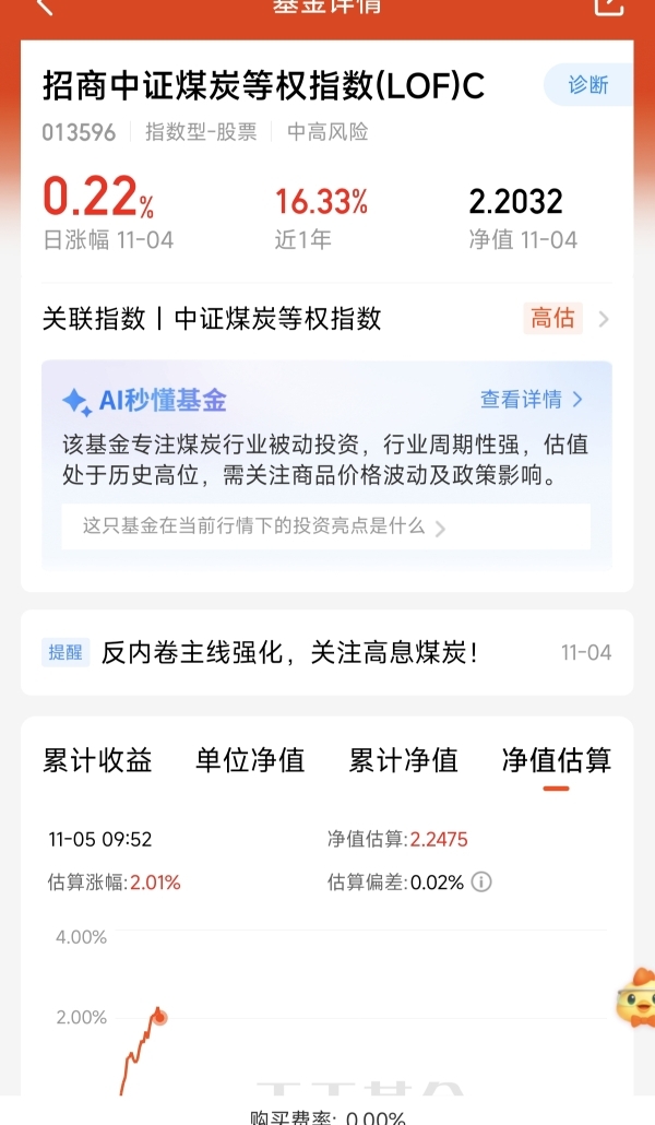 $招商中证煤炭等权指数(LOF)C$ 这只聚焦煤炭产业的指数基金。紧跟中正煤炭指数,全面覆盖了煤炭产业上下游。长期来的表现一直不错。昨天又上涨0.22%。今天早盘估值又上涨超两个点。而且同类业绩长期也是做到了优秀。我看好四季度继续能破新高。