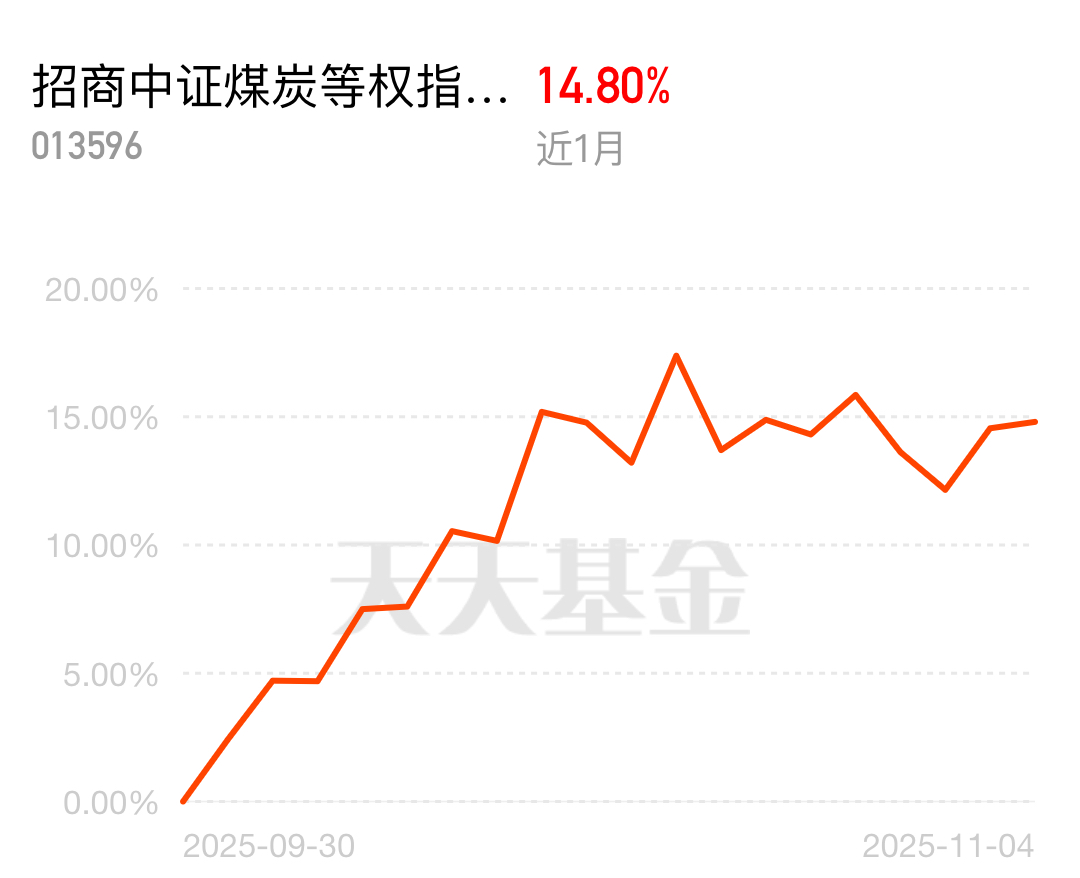 今天开盘,煤炭板块比昨天更活跃,早盘就涨了不少,势头不减。招商中证煤炭等权指数C近1个月14.98%,表现很突出。$招商中证煤炭等权指数(LOF)C$
