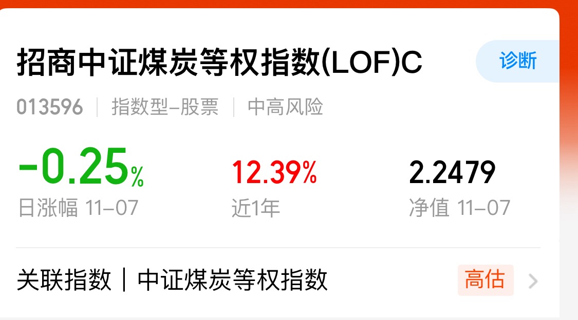 今天打牌行情分化的还是挺明显的,前面一直在涨的科技,今天又继续回调了,还好我一直看好的煤炭方向比较优秀,今天盘中估值又是上涨的$招商中证煤炭等权指数(LOF)C$ 随着冬季来临,煤炭真的是越来越强了,我继续看好这只基金,因为它的业绩不管是长期还是短期做得都是很优秀,近一周的涨幅达到4.44% 近3个月的涨幅已经达到14.27%