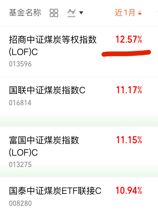 $招商中证煤炭等权指数(LOF)C(OTCFUND|013596)$近一月+12.57%