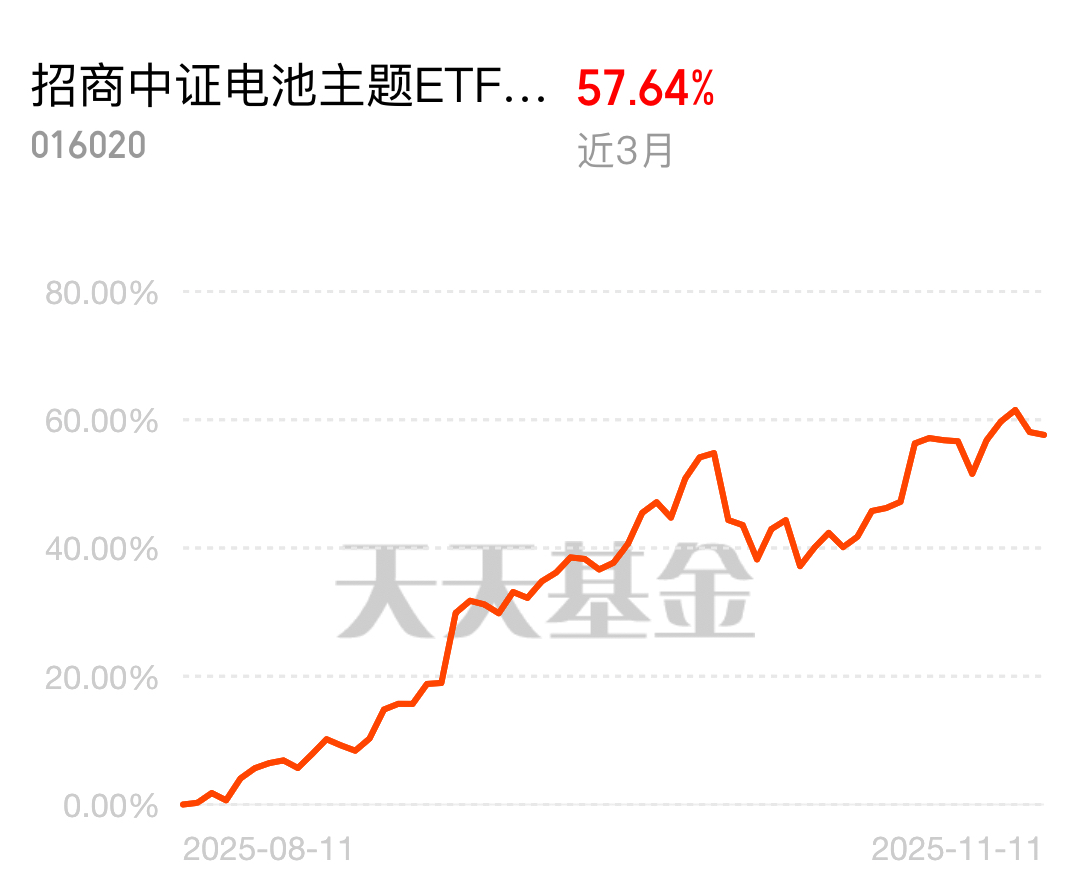 现在市场对电池技术关注度越来越高,固态电池、大电芯迭代不断,招商中证电池主题ETF联接C近三个月大涨57.64%,近一年收益排名第一,昨天波动时跌得最少,紧跟行业趋势就是牛。