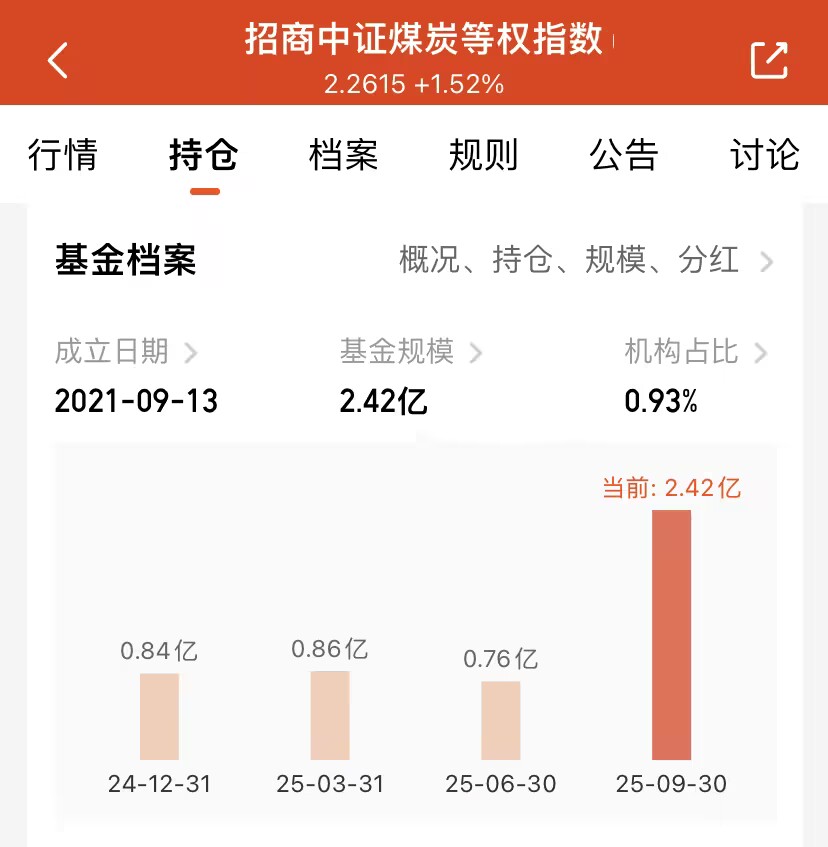 最近大盘短线赚钱效应一般,但四季度能稳住已经挺强势。咱们别慌,震荡正是挑板块的好时候。老话“夏炒电,冬炒煤”真没说错,北方供暖一启动。$招商中证煤炭等权指数(LOF)C(OTCFUND|013596)$近期表现亮眼,近一个月涨了12.56%,今天估值还是红的,需求端有支撑,基金规模翻倍增长,看来许多机构资金的选择。