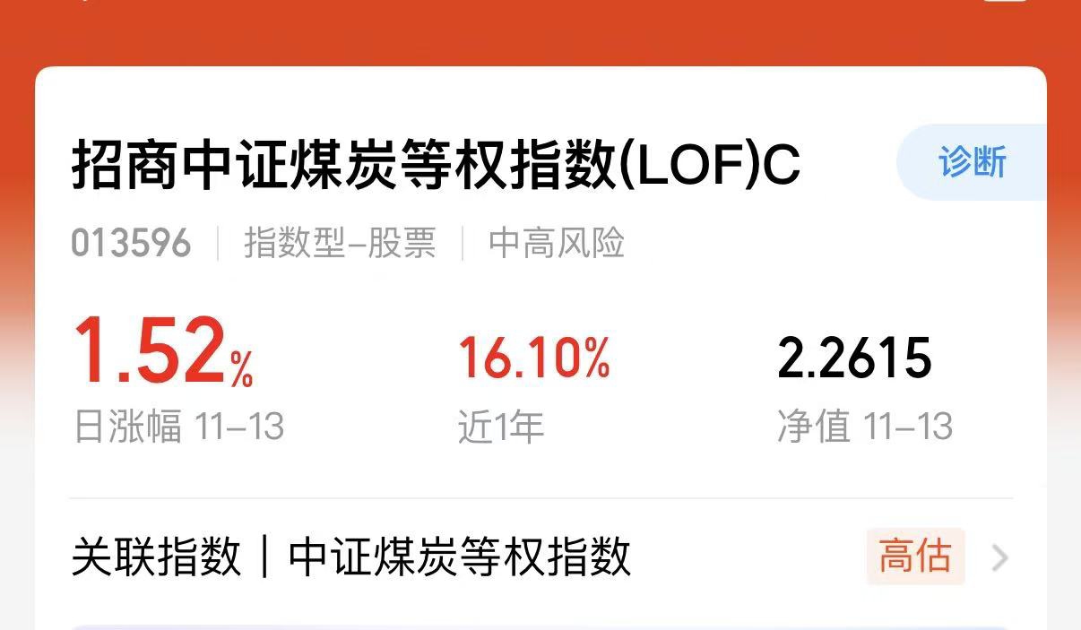 今天大盘又开始调整了,前段时间火热的板块,今天又是回调了,不过煤炭板块倒是一直在线走强,可能也是由于冬季到来的原因,这个行情也是顺势起来了。$招商中证煤炭等权指数(LOF)C$ 这只基金昨天上涨1.52%我继续看好后面的行情。