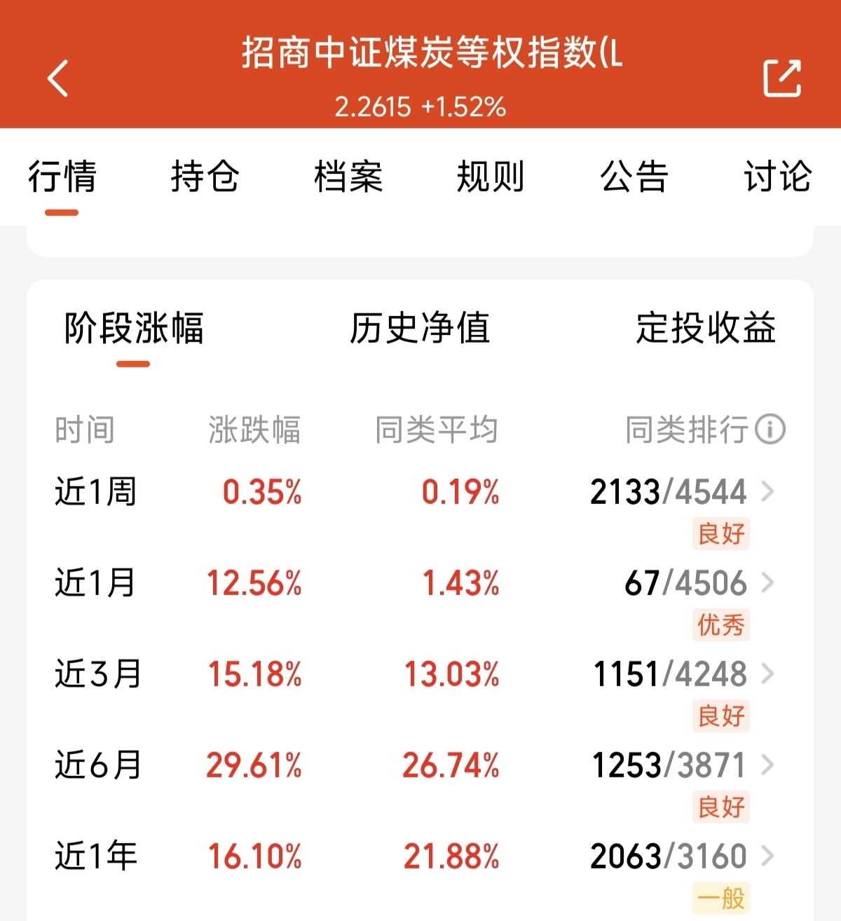 下午来看市场还是很难拉回来呀。目前避险的情绪还是比较高。稳定性好的还是煤炭,$招商中证煤炭等权指数(LOF)C$ 这次聚焦煤炭的指数基金。近一周上涨了0.35%。都是稳定跑赢了同类平均业绩,近1月上涨了12.56%。稳定盈利的能力是真的强啊。期待继续创新高了。