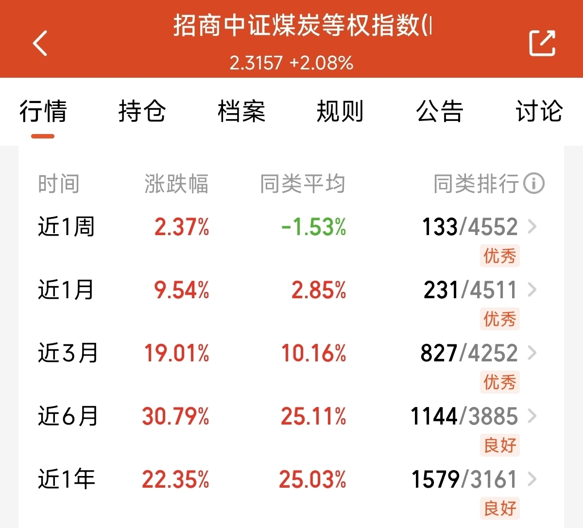 三大指数今天再度出现回调,不过在最近市场的震荡中,煤炭板块表现的还是比较稳,$招商中证煤炭等权指数(LOF)C$ 这是聚焦煤炭产业的指数基金。近一周上涨了2.37%。同类平均都是回撤的。全面覆盖了煤炭产业的上下游产业链。目前四季度煤炭预期持续向好,期待继续创新高。