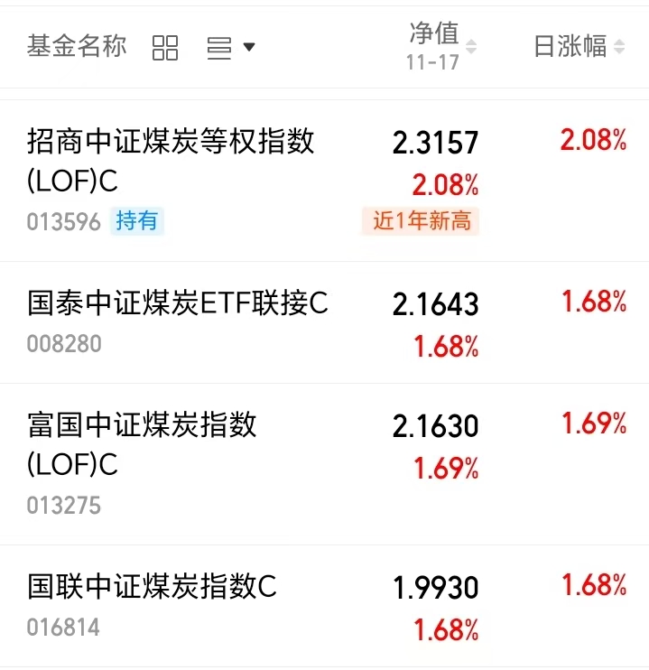 $招商中证煤炭等权指数(LOF)C(OTCFUND|013596)$昨天上涨2.08%;