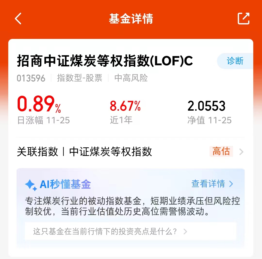 第四季度也已经过半了,寒冷的冬季,煤炭板块行情有暖意上涨,反内卷政策也给煤炭、化工、钢铁等周期板块带来了红利,上涨超预期。$招商中证煤炭等权指数(LOF)C(OTCFUND|013596)$昨天上涨0.89%,近一年上涨8.67%,在降息周期内价值风格或相对成长风格走强,期待涨幅拉升。