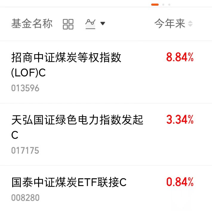 $招商中证煤炭等权指数(LOF)C(OTCFUND|013596)$近一年上涨8.84%$天弘国证绿色电力指数发起C(OTCFUND|017175)$近一年上涨3.34%