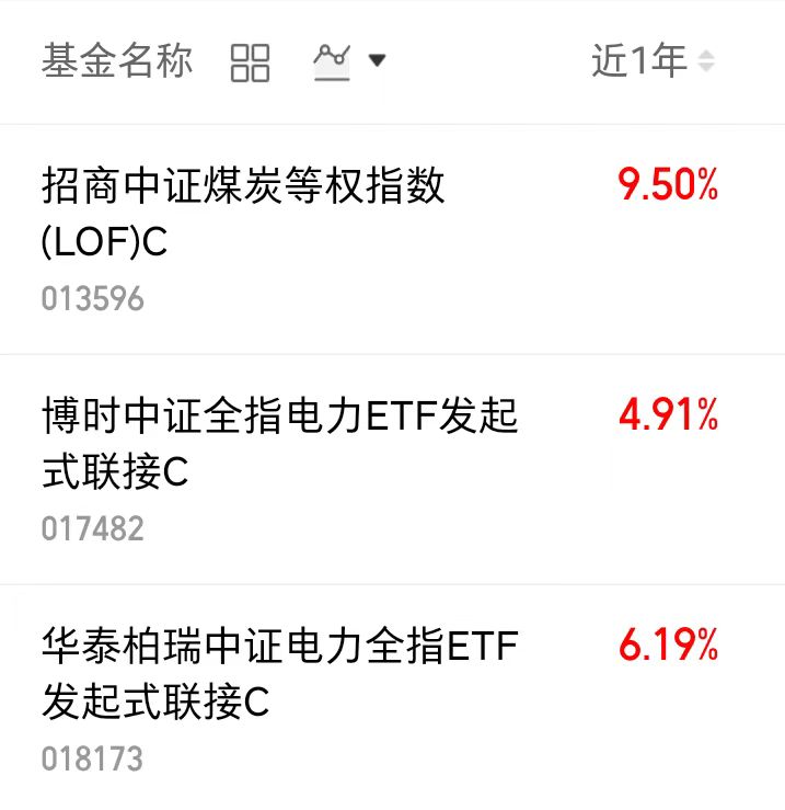 $招商中证煤炭等权指数(LOF)C(OTCFUND|013596)$近一年上涨9.5%$博时中证全指电力ETF发起式联接C(OTCFUND|017482)$近一年上涨4.91%