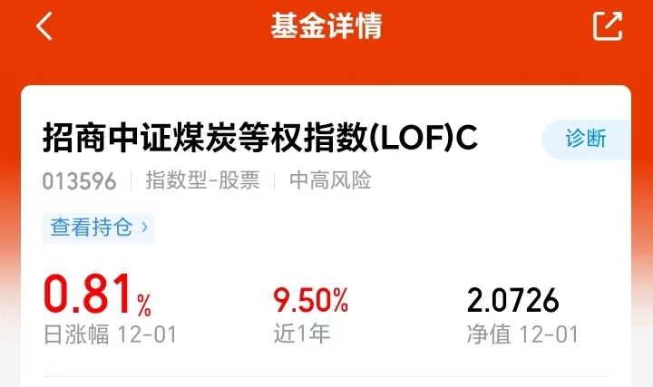 我持有的$招商中证煤炭等权指数(LOF)C(OTCFUND|013596)$近1年涨了9.5%,表现挺亮眼,看好后续反弹,觉得逢低布局是个不错的选择,打算慢慢加仓试试。