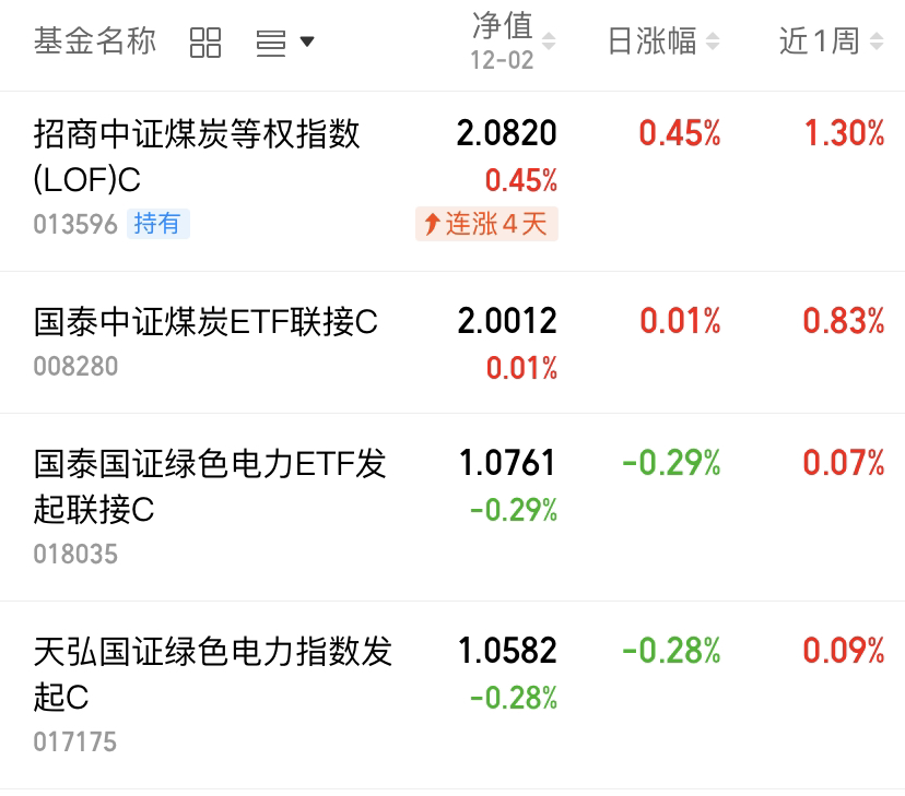 煤炭作为传统能源压舱石,需求稳得很 —— 冬天供暖、工业用能都离不开它。对应基金跟着煤炭板块走,市场震荡时抗跌性给力,$招商中证煤炭等权指数(LOF)C(OTCFUND|013596)$近1周上涨1.3%,$国泰国证绿色电力ETF发起联接C(OTCFUND|018035)$近1周上涨0.07%,$天弘国证绿色电力指数发起C(OTCFUND|017175)$近1周上涨0.09%。