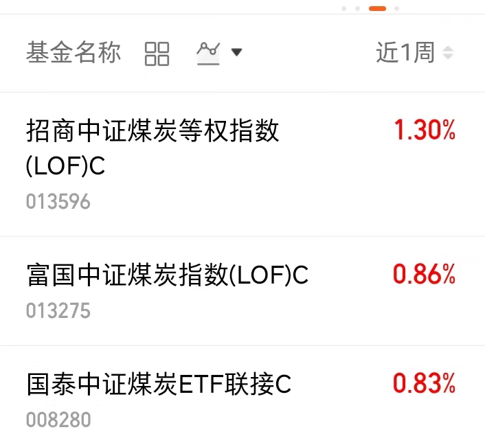 $招商中证煤炭等权指数(LOF)C(OTCFUND|013596)$近一周上涨1.3%$富国中证煤炭指数(LOF)C(OTCFUND|013275)$近一周上涨0.86%