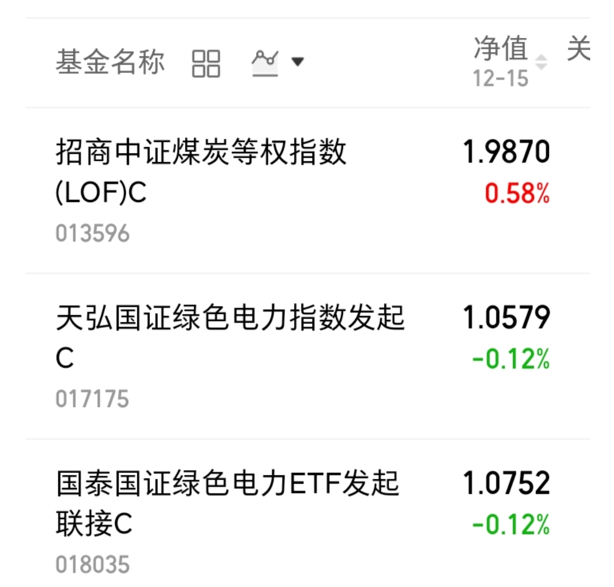 我持有的招商中证煤炭等权指数(LOF)C(OTCFUND|013596)昨天又涨了0.58%,看来四季度这个板块确实有点看头。另外两只绿色电力基金天弘国证绿色电力指数发起C(OTCFUND|017175)和国泰国证绿色电力ETF发起联接C(OTCFUND|018035)都微调了0.12%,波动不算大。最近行情反复,我打算多观察观察再做打算。
