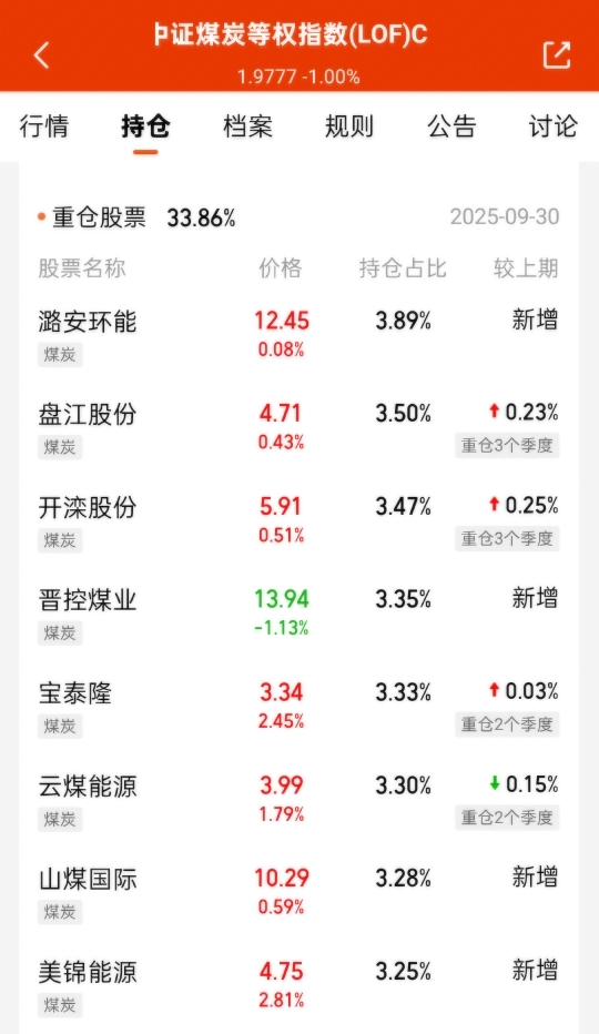 招商中证煤炭C,持仓聚焦潞安环能、盘江股份等优质煤炭股,采用等权重策略,提升小票占比,更具进攻性,今天持仓上涨个股多。