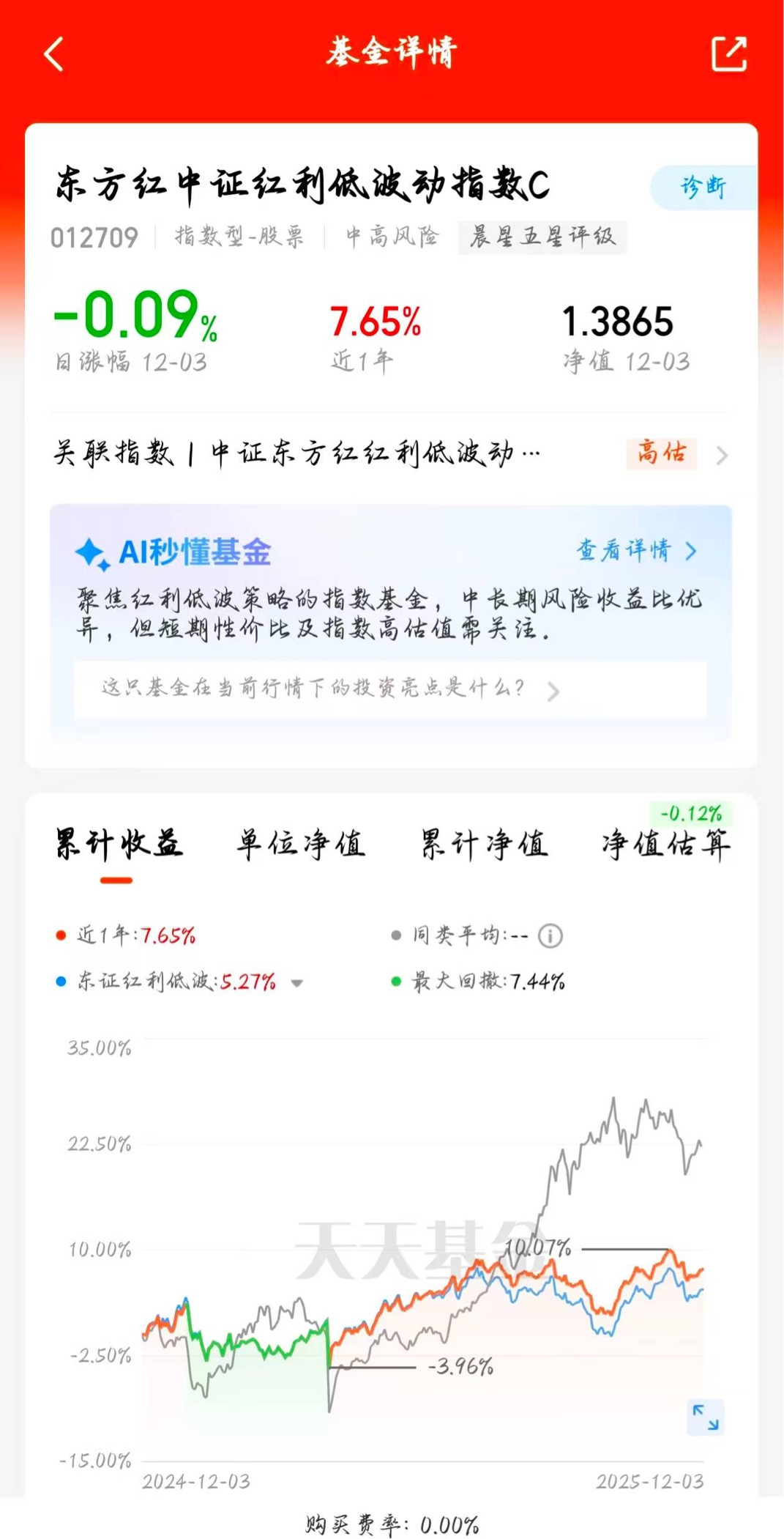 眼下低波动、能防御的产品吃香,东方红中证红利低波动指数C一年7.65%的涨幅领跑红利赛道,年底回调刚好可以考虑。
