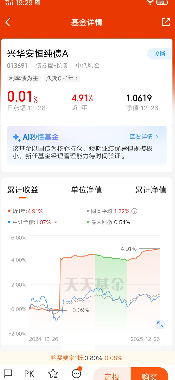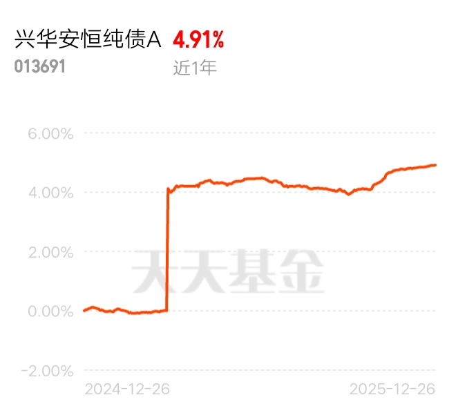 2025年即将过去,2026年马上到来。2025年的投资市场相信大家都会有所收获,展望2028年,我认为应以债券为主。把2025年盈利的资金投资债基。是我认为比较安全的操作。$兴华安恒纯债A$ 是一支纯债基金,近一年上涨4.91%,从2021年11月10日成立,成立至今年年正收益,成立至今上涨14.43%。今年以来已上涨4.85%。这样的收益率,比银行定存利率高了几倍有余,是时候把存款转移到纯债基金了。@兴业基金