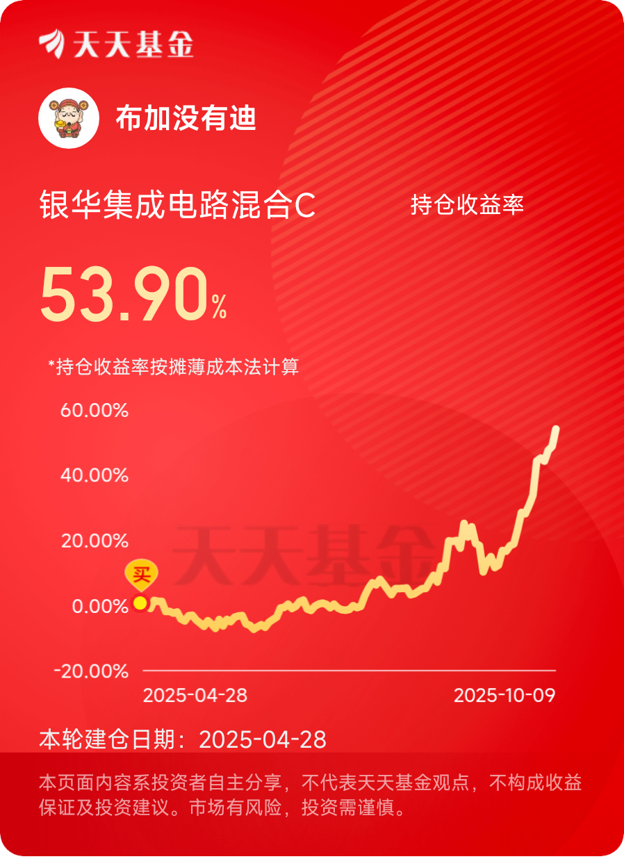 站在十月的投资路口,市场的结构性机会愈发清晰,科技成长赛道的长期价值无需赘言。银华集成电路混合C以53.90%的收益率证明了其投资价值,而我更看重其在产业升级浪潮中的持续成长能力。未来,我将继续坚守这一核心标的,在长期持有与适时加仓中,分享国产集成电路产业崛起的时代红利。@银华基金 #晒收益#