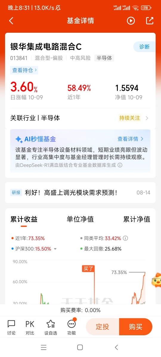 对于中高风险的权益类基金而言,风险控制能力至关重要。银华集成电路混合C虽近12个月波动率达到73.35%,但通过集中布局高景气赛道的优质标的,实现了风险与收益的有效平衡 。基金93.76%的股票资产配置虽显示出较高的进攻性,但前十大重仓股的均衡布局与对业绩确定性的坚守,有效降低了组合的非系统性风险。在我的持有过程中,基金最大回撤始终控制在合理区间,远低于同类主题基金平均水平,展现出较强的风险抵御能力。