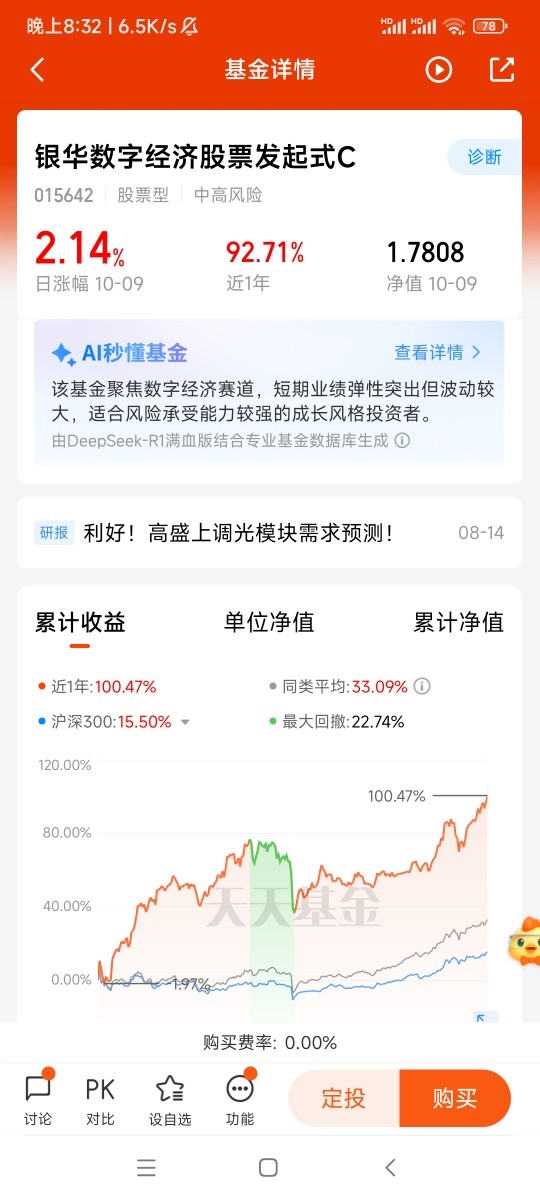 基金的净值表现始终保持行业领先水平。数据显示,该基金近一年涨幅达到58.49%,远超同类基金平均水平,而近6个月53.68%的涨幅更是印证了其长期赚钱能力 。在我的持有周期内,即便遭遇市场短期回调,基金也能凭借精准的持仓调整快速修复净值,例如2025年二季度市场波动期间,基金通过聚焦半导体设备等高景气细分领域,实现了净值的逆势增长,这种抗跌性与反弹力正是优秀基金的核心特质。