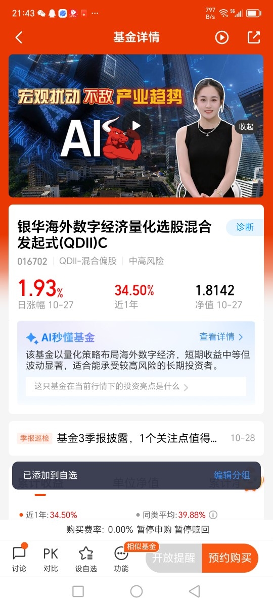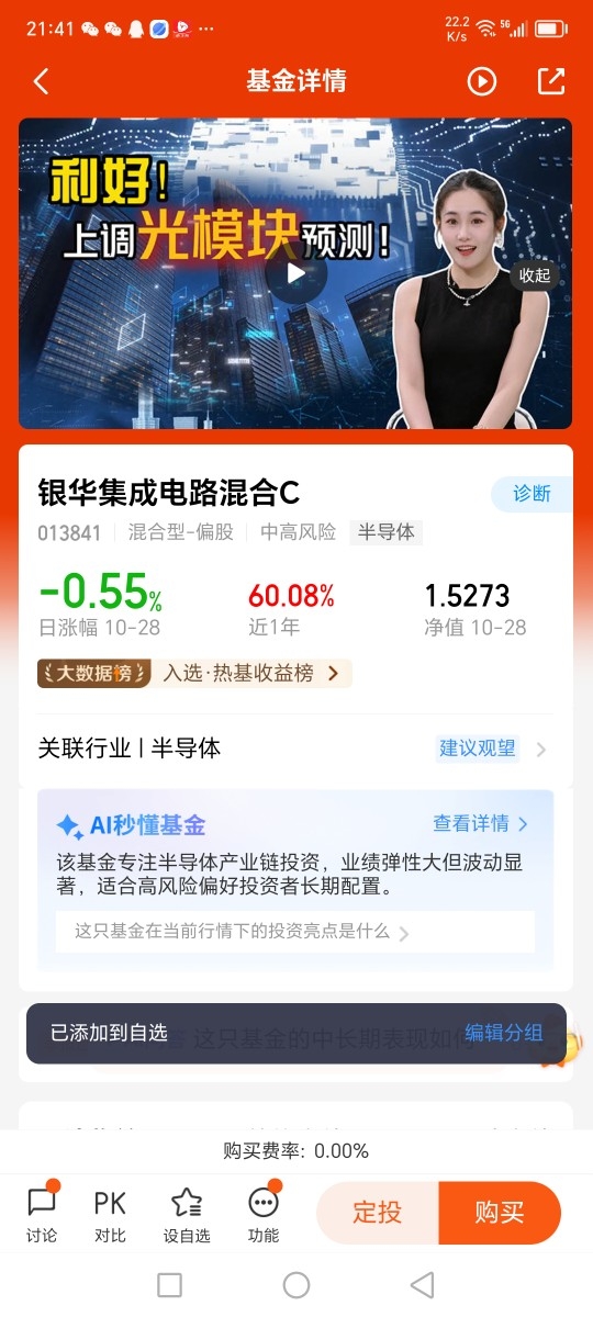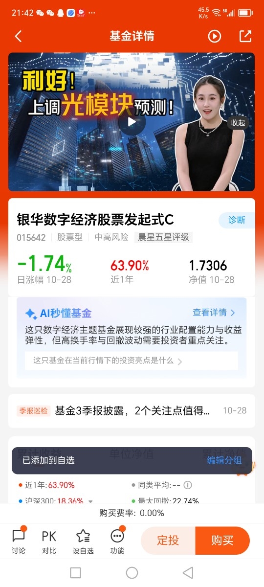 从市场理解来看,科技行业虽短期受宏观波动影响,但长期增长逻辑坚实。例如,AI正从概念走向落地,半导体国产替代在外部环境不确定下加速,这些因素为投资提供了结构性机会。我关注过图中的银华数字经济C(015642) 和银华集成电路C(013841),这两只基金聚焦AI技术和半导体,C类无申购费的设计适合中短期布局。以我的持有体验来说,银华数字经济C在AI主题回调时虽有一定波动,但基金经理对技术趋势的把握较精准,近期随AI热点回暖表现稳健;银华集成电路C则更侧重硬件和国产替代,在政策利好下弹性较强,但需注意行业周期风险。整体上,银华基金投研团队对科技赛道的覆盖专业,适合愿意承担适度波动以换取长期增长的投资者。