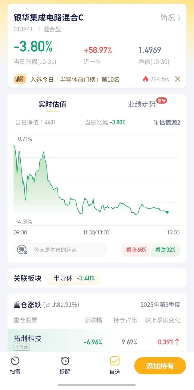 银华集成电路混合C今日预估涨幅-3.79%!集成电路板块今日调整,关注后续走势。