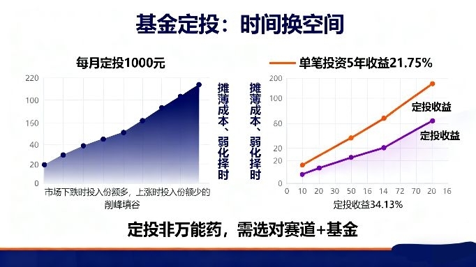 基金定投的本质是“时间换空间”,通过定期定额买入,天然具备摊薄成本、弱化择时的效果。举个栗子:若每月定投1000元,市场下跌时能买更多份额,上涨时则买较少份额,长期下来成本被“削峰填谷”,波动风险自然降低。历史数据显示,定投在震荡市中尤其有效,比如某基金单笔投资5年收益21.75%,而定投收益高达34.13%。