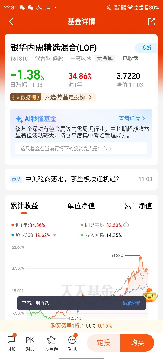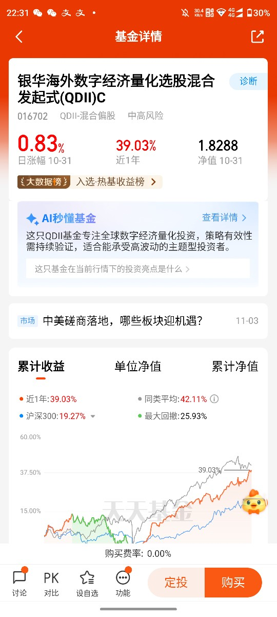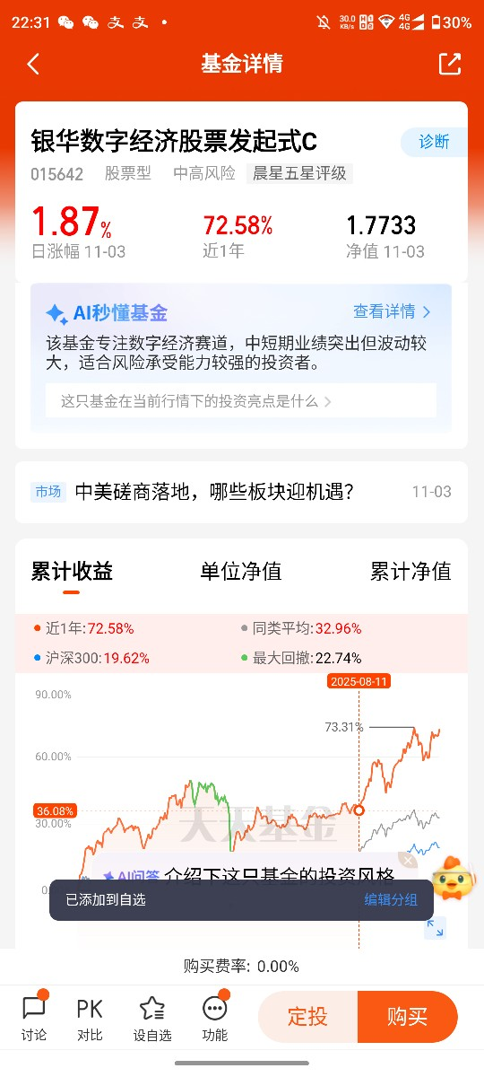 该基金为中高风险的契约型开放式基金,成立于2021年12月,投资风格偏向平衡型。截至11月3日,其最新净值为1.4196,近12个月波动达45.69%,近3个月波动35.22%,体现出成长板块的典型波动特征,同时中长期收益弹性可观。