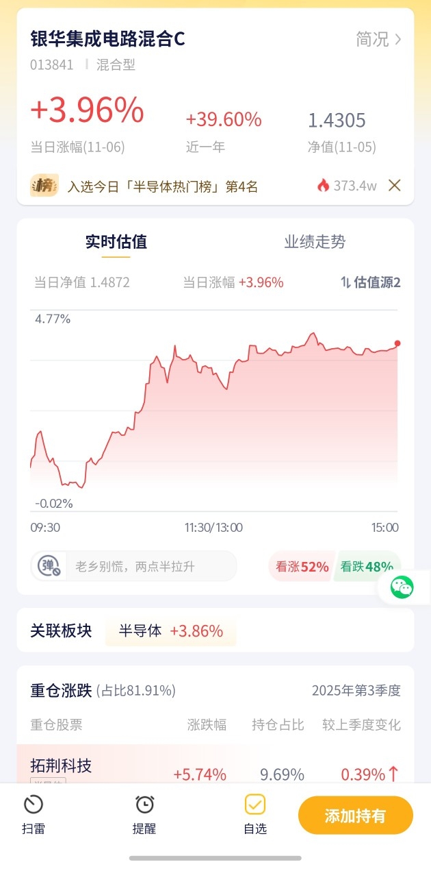 银华集成电路混合C今日预估涨幅3.96%!半导体板块回暖,该基金表现亮眼