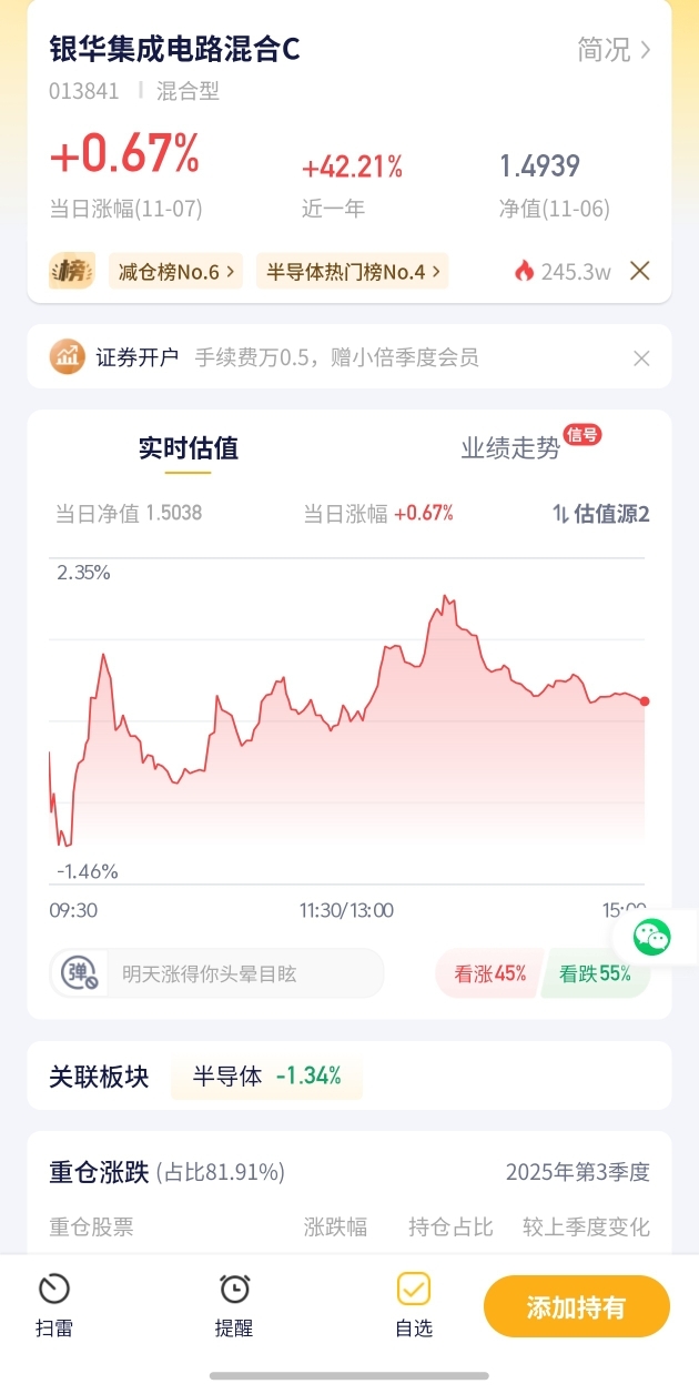 银华集成电路混合C今日预估涨幅0.67%!半导体板块表现平稳,该基金领涨自选,值得关注