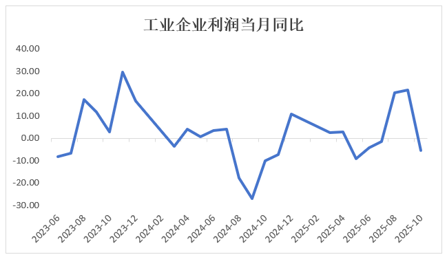 根据国家统计局发布的最新数据,2025年1-10月全国规模以上工业企业利润总额累计同比增长1.9%,维持增长,但10月当月同比增速为-5.5%,较前值同比增长21.6%大幅回落,反映出当前工业企业利润增长修复过程中面临着一定的波段扰动。(数据来源:国家统计局)
