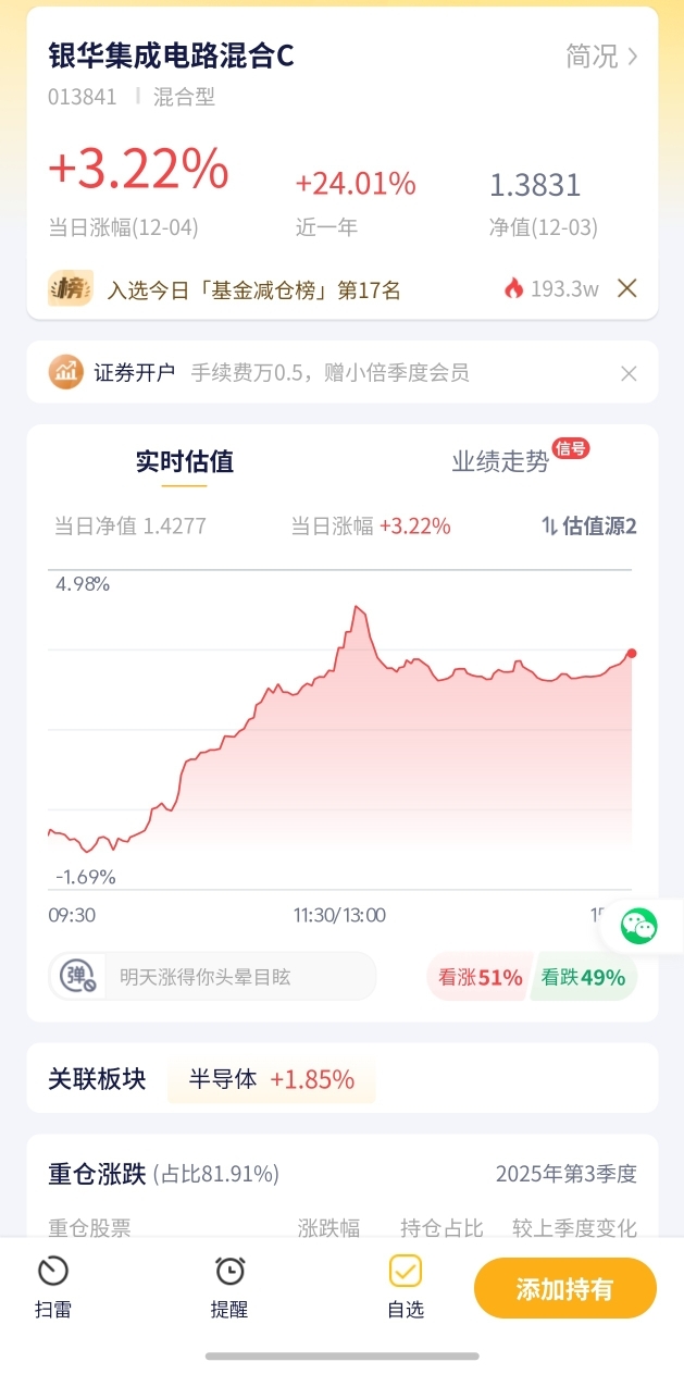 银华集成电路混合C今日预估涨幅3.22%!在半导体板块带动下,这只基金领跑自选,表现很给力