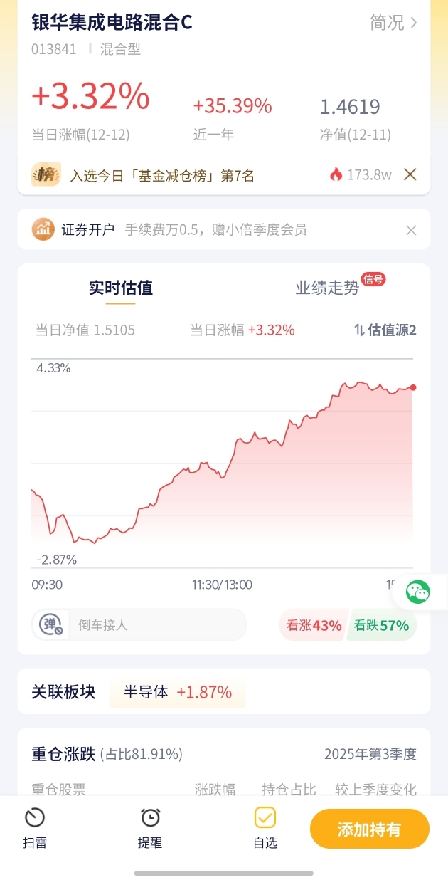 1. 【银华集成电路混合C估值播报+12.12行情】银华集成电路混合C今日预估涨幅3.32%!集成电路板块表现强势,该基金领涨自选,表现亮眼。