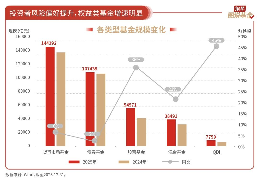 6、36%:股票基金规模增加36%,投资者风险偏好提升。相比2024年末,虽然货币基金规模稳居各类型基金之首,但其增速已明显放缓,远低于股票基金36%的规模增幅,资金正逐步从流动性管理工具转向更具收益吸引力的产品。