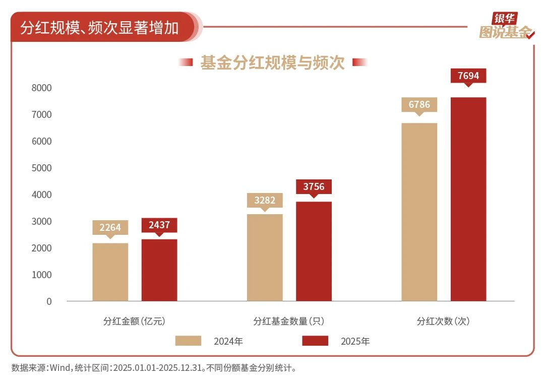 8、2437亿元:公募基金分红总额达2437亿元,创近3年新高。2025年,全市场共有3756只公募基金实施分红,累计分红达7694次、分红总额为2437亿元,较2024年实现明显增长。