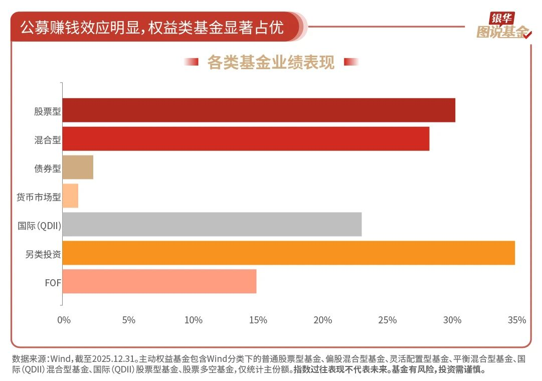7、31.40%:主动权益基金平均收益31.40%,赚钱效应显著。2025年,公募基金各类型产品均实现正收益。全年主动权益基金平均收益率达31.40%,收益超50%的主动权益基金达826只,更有76只产品实现收益翻倍。