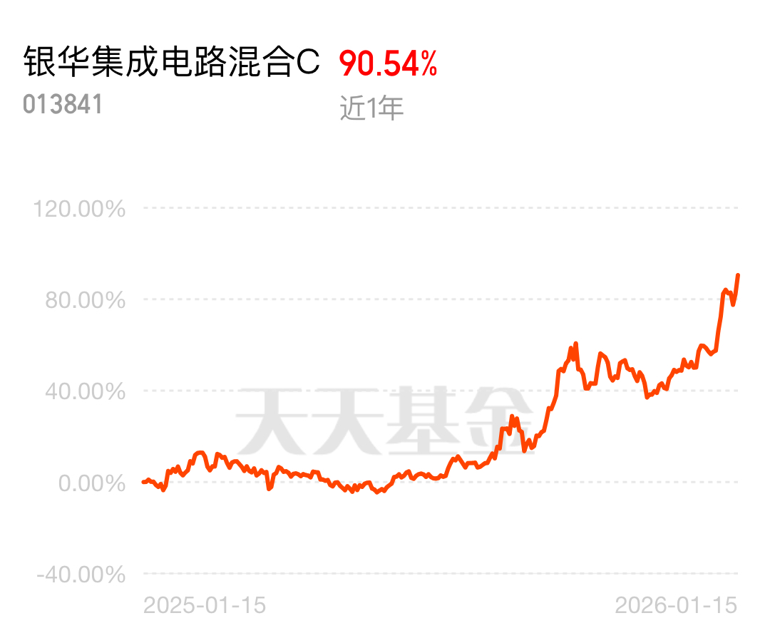 国产半导体设备自给率已超 55%,刻蚀、清洗设备渗透率突破 60%,国产替代驶入快车道。银华集成电路混合 C 紧紧抓住这波机遇,近 1 年涨幅达 90.54%,聚焦半导体核心赛道,跟着行业红利走准没错。