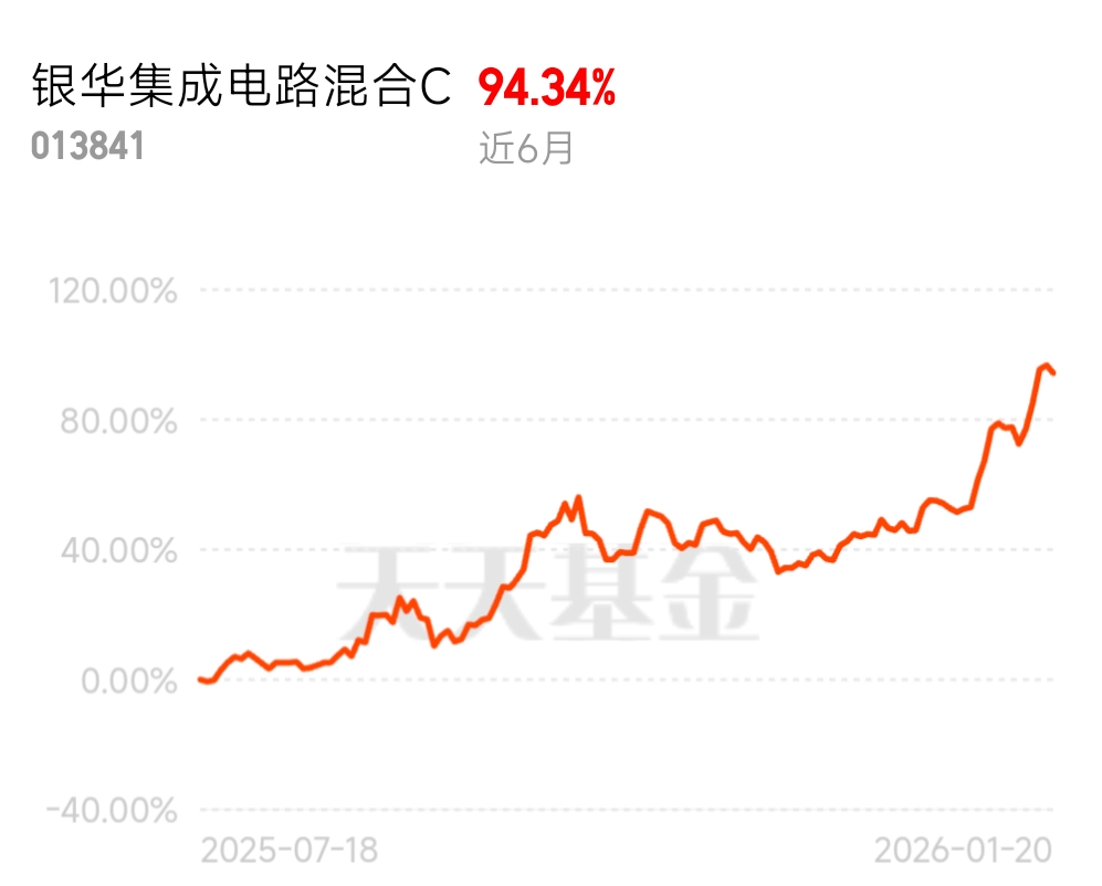 近一年业绩翻翻,近半年涨超94%以上,半导体设备产业链覆盖面很广,弹性十足爆发力杠杠滴,$银华集成电路混合C$