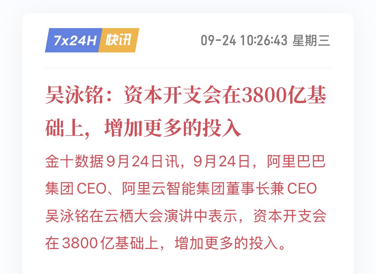 先说AI算力需求的高增长。AI革命本质上是对人类认知和算力瓶颈的突破,这直接驱动了对数据处理和存储能力的海量需求。从训练到推理,从云端到边缘,都离不开最底层的半导体硬件。在此背景下,全球科技巨头纷纷加大资本开支以抢占算力高地。其中,国内互联网巨头阿里巴巴已公开宣布了一项大规模投资计划“计划在未来三年投入至少3800亿元人民币用于人工智能和云计算基础设施建设。”该投资规模被指出将超过其过去十年在云和AI基础设施上的投入总和,凸显了其对AI驱动增长的全力押注。预示着底层算力硬件与相关产业链将持续迎来高景气周期。
