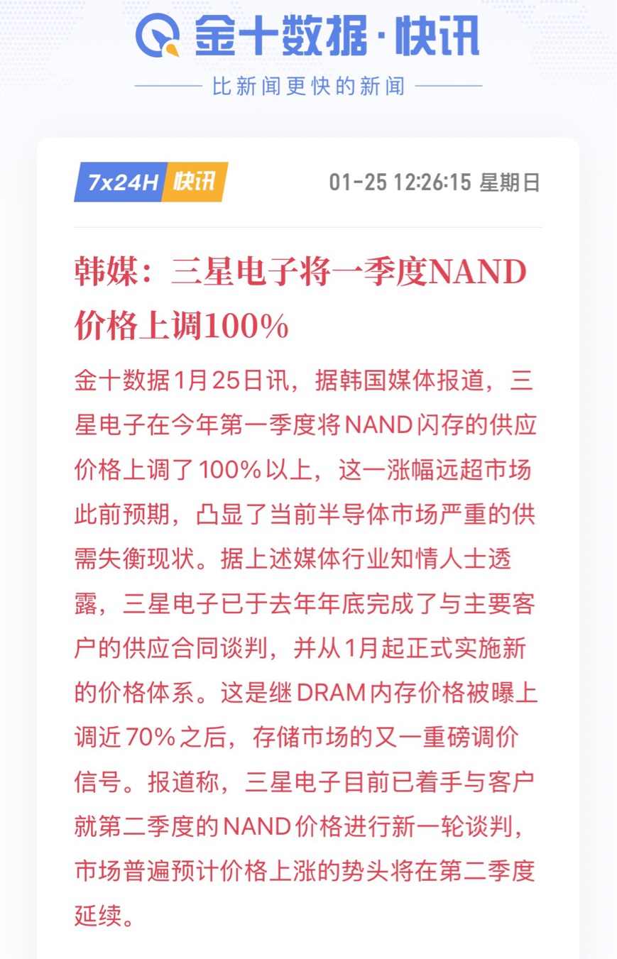 首先是涨价。就在不久前,三星电子等存储巨头将2026年第一季度的NAND闪存合约价格上调了超过100%,远超市场此前预期的30%-50%。涨价的底气来自于供给紧张、AI需求爆发以及行业寡头的定价权。市场普遍预期,这一轮涨价趋势可能会贯穿2026年全年。