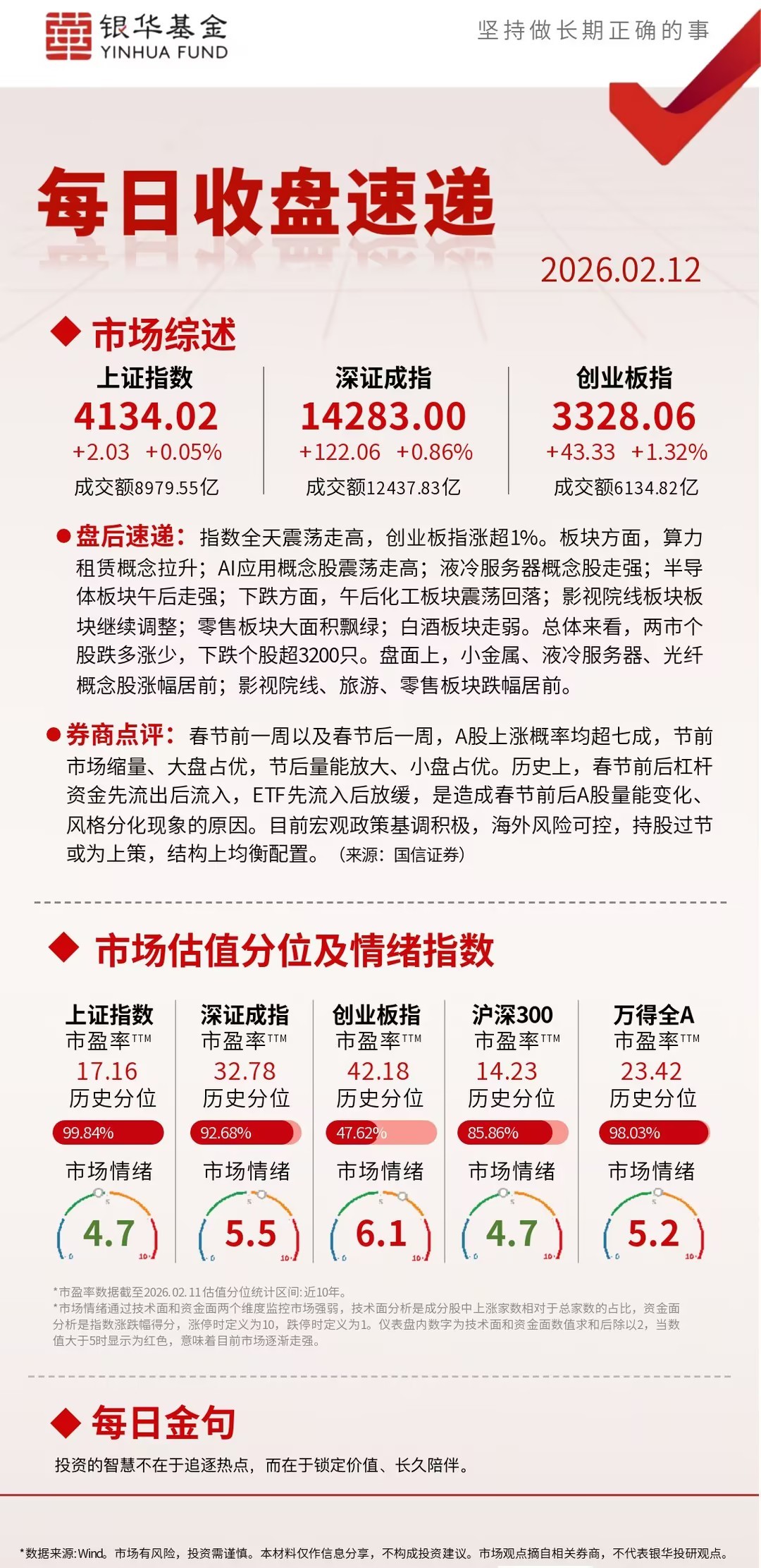 每日收盘速递 | 2026.2.12 创业板指涨超1%,AI应用概念股走强