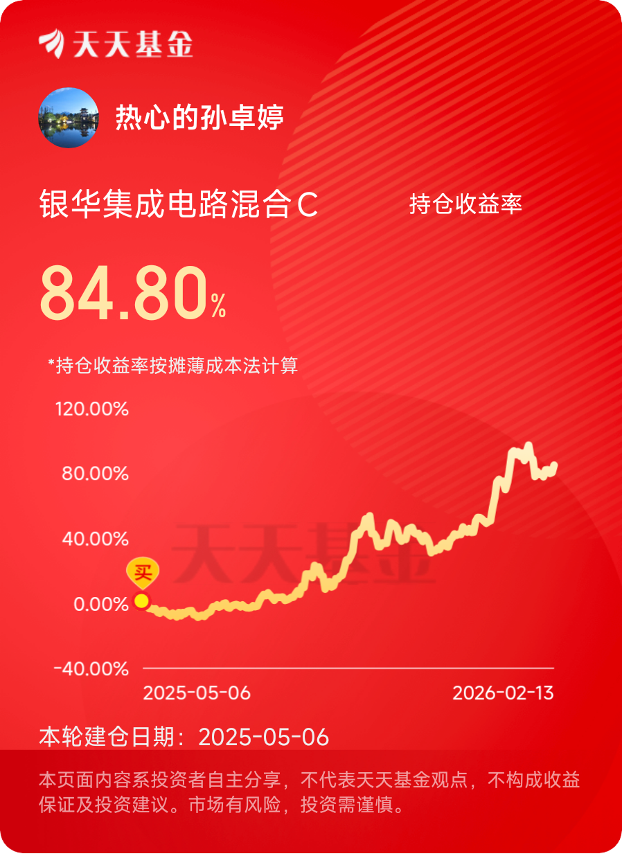 这84%的收益,不是我运气好,是我选对了时代的赛道,选对了靠谱的基金经理,坚持了定投的初心。2026年,我依然会带着敬畏之心,继续在这条路上走下去,不贪多,不恐慌,慢慢积累属于自己的第一桶金。@银华基金