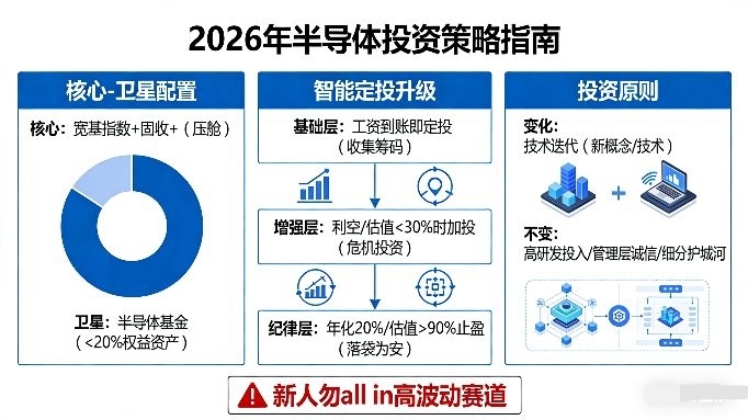面对半导体这种高波动、高成长、技术日新月异的赛道,我2026年的策略核心非常明确:核心-卫星配置,智能定投为舟,深度认知作帆。在这里也把我的策略完整分享给大家,尤其是和我一样的新人朋友,绝对不要all in高波动赛道。