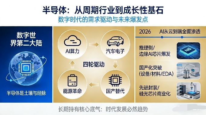 很多人至今还把半导体当成“涨一年跌三年”的周期性行业,但在我这个刚踏入社会、全程浸泡在数字时代的新人眼里,它的属性早已完成了从“周期”到“成长性基石行业”的升维。