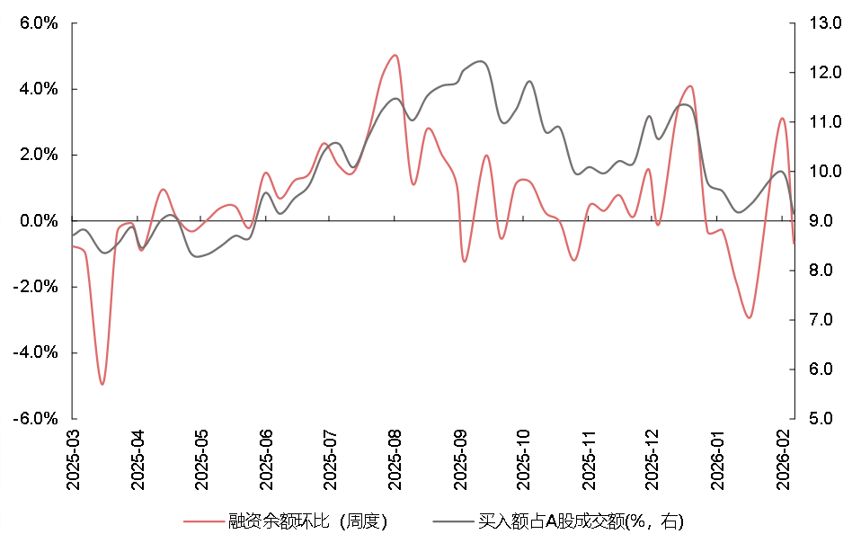 数据来源:Wind,2025.2-2026.2;左轴为融资余额环比(周度)